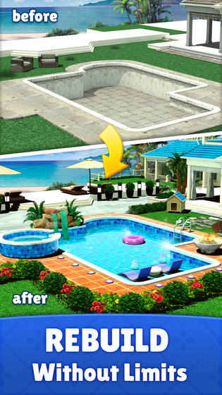 Optimized game performance and bug fixes for a better experience. A building built on the caribbean beach. Design new home decor and furniture by matching blocks power up in various levels and renovate your paradise house including your kitchen and garden in this free home design game.